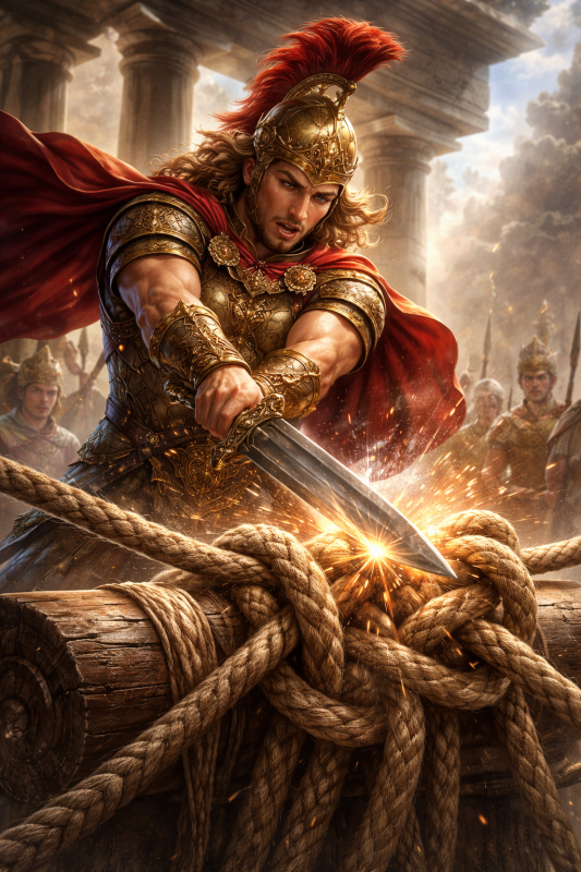Sin embargo, tras intentar desatarlo, sin éxito, se apartó de las cuerdas retorcidas y proclamó: “No importa cómo se desaten estas cuerdas.” Tras estas palabras, sacó la espada de la vaina y partió el nudo por la mitad de un solo golpe.